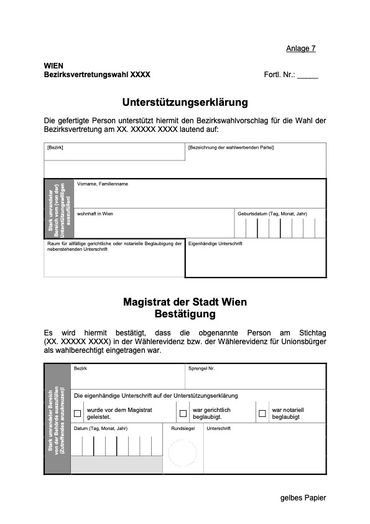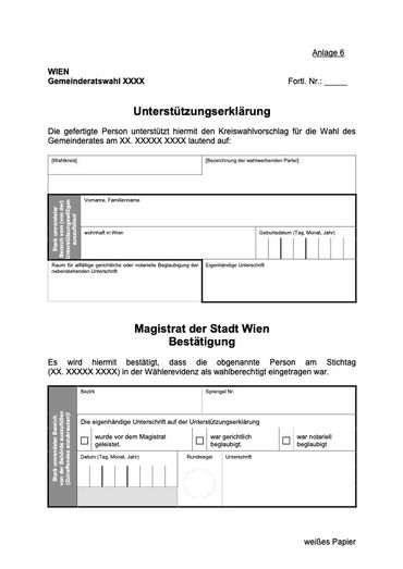 Damit eine Partei bei der Wienwahl antreten kann, benötigt sie Unterstützungserklärungen von wahlberechtigten Bürgerinnen und Bürgern. Diese stellen sicher, dass die Partei zur Wahl zugelassen wird. Jede wahlberechtigte Person mit Hauptwohnsitz in Wien kann eine Unterstützungserklärung abgeben.